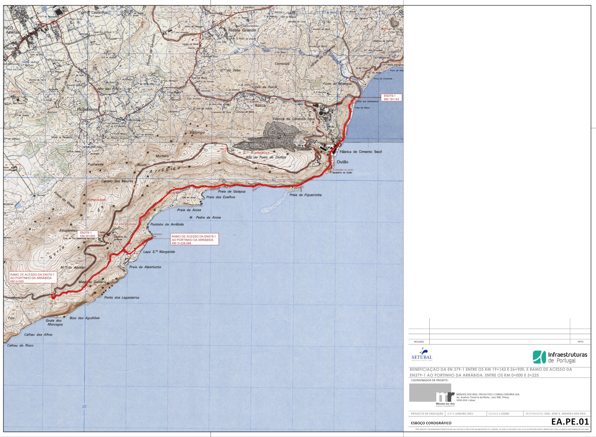 Execução da beneficiação da EN 379-1 entre os KM 19+143 e 26+900 e ramo de acesso da EN379-1 ao Portinho da Arrábida, entre os Km 0+000 E 3+225, Concelho de Setúbal. A EN 379-1 encontra-se classificada no PRN2000 como estrada regional no troço entre Aldeia de Irmãos e o Outão, ficando o restante trecho desclassificado (por municipalizar), entre a EN 10-4 o Portinho da Arrábida, bem como o Ramal de Acesso ao Portinho da Arrábida. Em situações normais, estas estradas têm pouca solicitação de tráfego. No entanto, na época balnear, verifica-se uma sobre utilização das vias, além da sua capacidade, bem como a ocorrência de estacionamento ilegal ao longo das suas bermas, o que impossibilita a circulação fluída, incluindo para os veículos de emergência, com as consequentes dificuldades em intervir ao nível de segurança, incêndios a acesso a pessoas em risco. A Câmara Municipal de Setúbal tem vindo a assumir, todos os anos e com o acordo das entidades com jurisdição na área, a implementação de sentidos únicos de trânsito. No entanto, esta solução tem-se revelado infrutífera, devido ao estacionamento ilegal que se verifica nas bermas. Na sequência da celebração do acordo com a APA, para manutenção das praias por parte do município, pretende a C.M.S. agir numa ótica integrada de beneficiação das praias e respetivas condições de acesso, razão pela qual propõe receber o troço desclassificado em causa. A C.M.S. pretende intervir na via, melhorando a circulação pedonal, e acima de tudo, apostar no uso do Transporte Público, o qual apenas será possível com a disciplina da circulação viária em transporte individual e do impedimento efetivo de estacionamento nas bermas. Para a integração na rede viária municipal, procedeu-se à elaboração de estudo de beneficiação das estradas, o qual define as intervenções mínimas de conservação dos pavimentos rodoviários, que as reponham em bom estado de utilização, desenvolvido em conformidade com o acordo equitativo entre a Infraestruturas de Portugal S.A. e o Município de Setúbal.