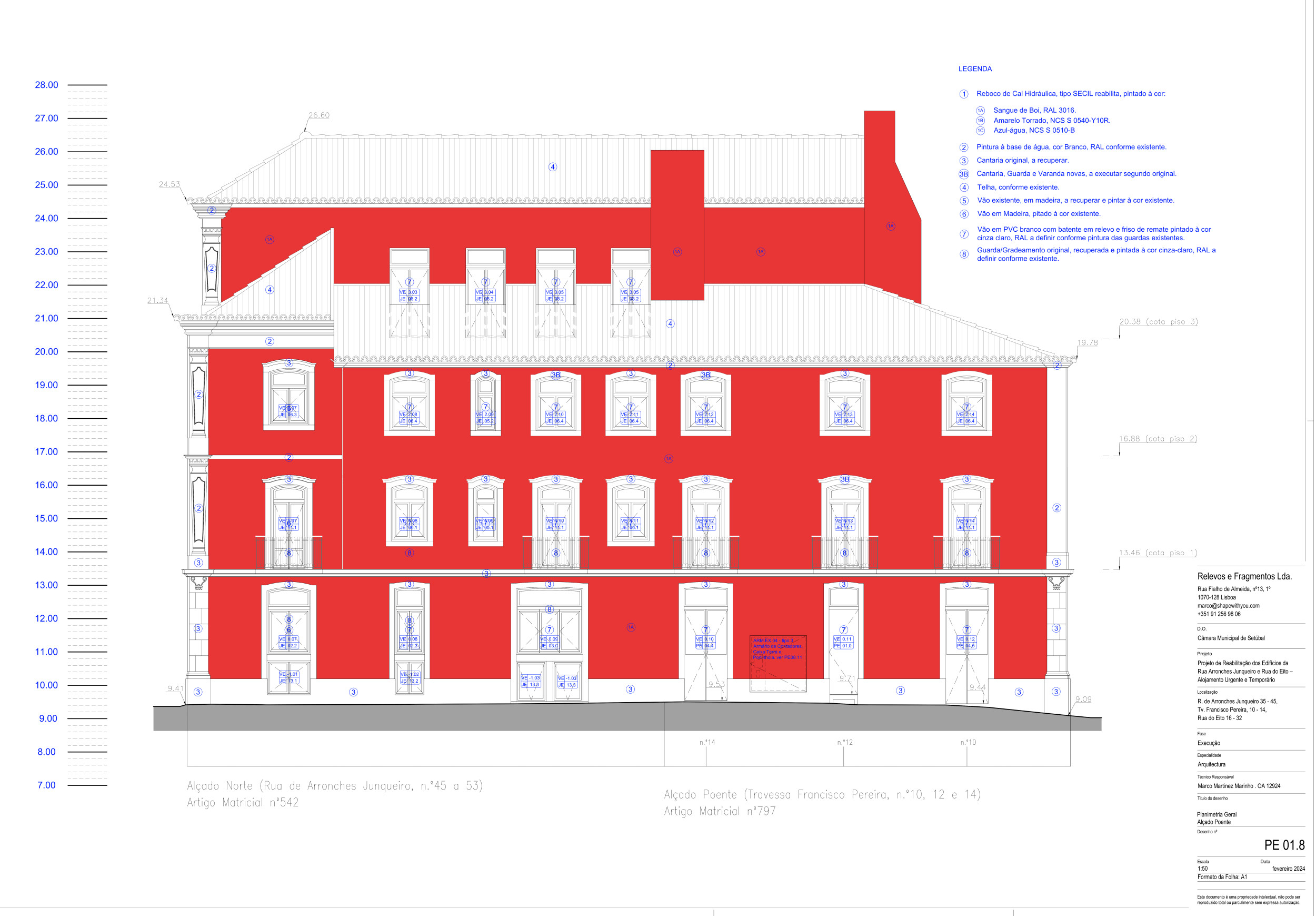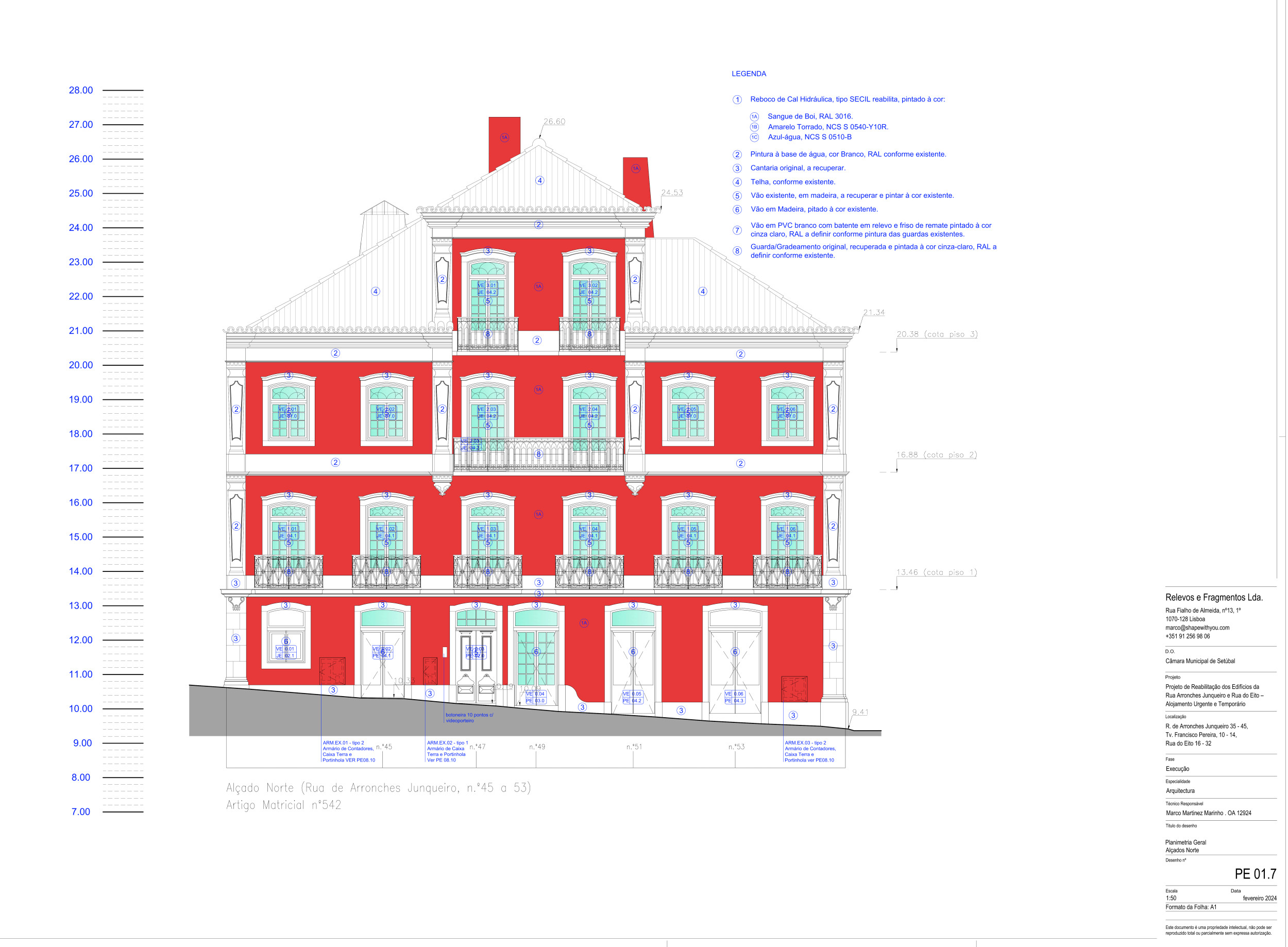 De uma forma geral, para as fachadas é proposta a manutenção da natureza dos materiais – reboco de cal —, prevendo a sua substituição por uma solução de reboco térmico à base de cal, de forma a dotar o edifício de uma melhor eficiência energética, bem como a manutenção das soluções de pinturas de revestimento —, mantida a cor do edifício apalaçado — sangue de boi (RAL 3009) — e propostas cores diferentes daquele e entre si de acordo com o cromatismo do centro histórico de setúbal.