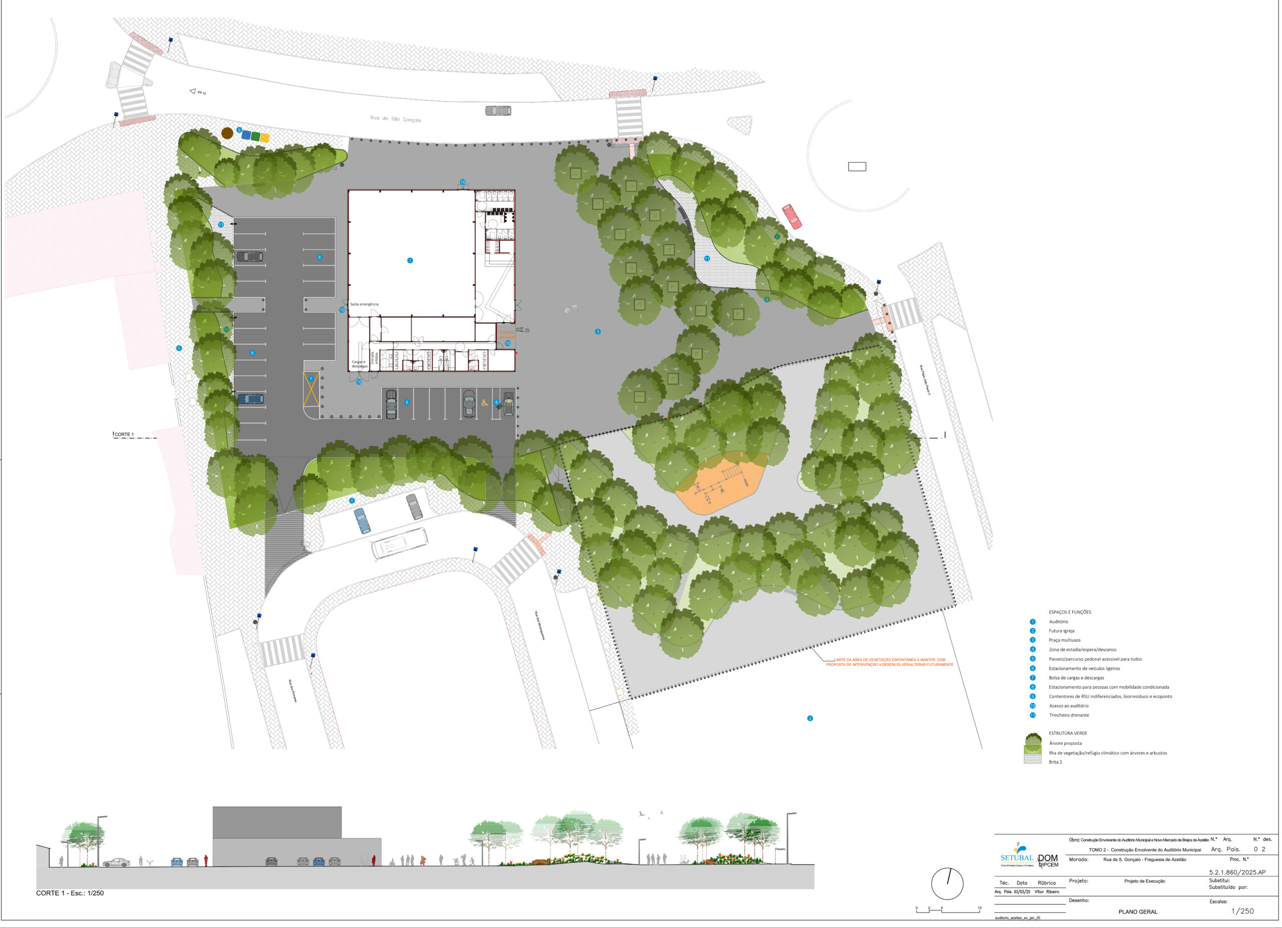 A proposta proporciona espaço multifuncional, acessível a todos, que promove a estadia informal e socialização, estando garantida a acessibilidade a todos os espaços de forma segura, contínua e confortável. O acesso principal ao auditório é feito a nascente, a partir de uma grande praça multiusos, arborizada com árvores em caldeiras com 1,60 x 1,60, a expandir futuramente para sul. O acesso de artistas e para descargas e descargas está previsto a sul, sendo os acessos de emergência a poente e norte. Todos os acessos ao auditório são feitos, no máximo com um desnível de 0,02 m. Foi assegurada a ligação pedonal a toda a área envolvente do auditório em pavimento de pavê de betão, sempre que possível, mantendo o pavimento existente (pavê). Preveem-se “ilhas” de vegetação biodiversas com árvores, arbustos e herbáceas e árvores em caldeira, que amenizam os volumes construídos e desempenham um papel crucial na melhoria do clima urbano, constituindo também um habitat para insetos polinizadores e pequenas aves. O estacionamento proposto inclui dois lugares para pessoas com mobilidade condicionada e um lugar para cargas e descargas, sendo o acesso ao mesmo a partir das Ruas dos Morangueiros e dos Pomares. Será mantida a ”ilha” para um molok de resíduos sólidos indiferenciados e um ecoponto para papel, plástico, metais e vidro, parcialmente circundada por uma zona verde.