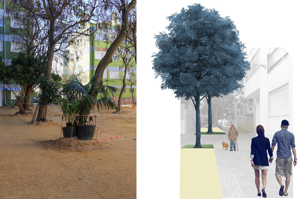 Assim a vermelho serão os locais de estadia e limite de estacionamento e a amarelo os locais para estacionar. As caldeiras das árvores são ampliadas para a dimensão das zonas de estacionamento e elevadas de forma a serem também um elemento organizador do espaço, para além de se conseguir resolver o problema de levantamentos de pavimentos pelas raízes.