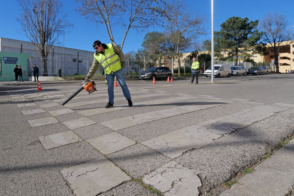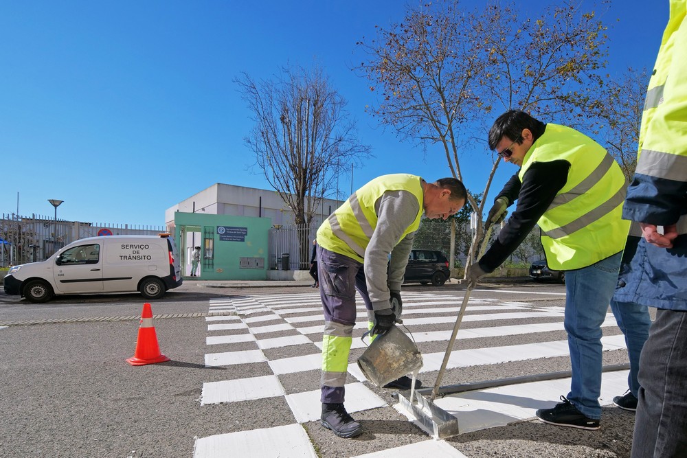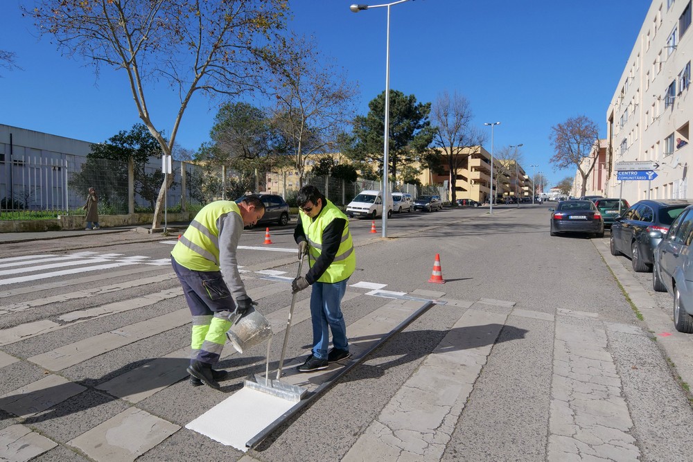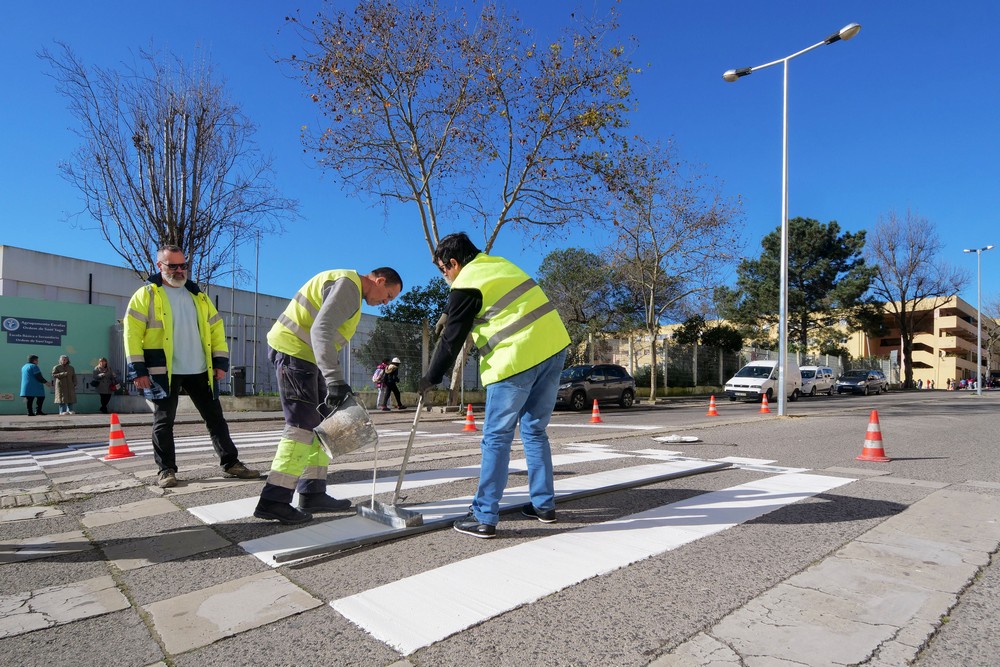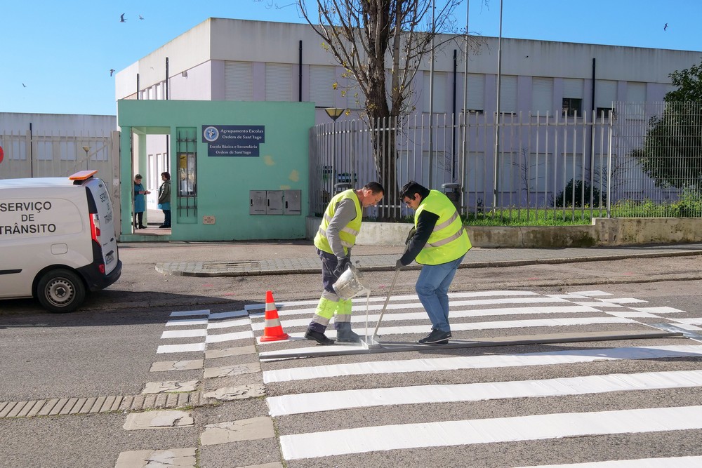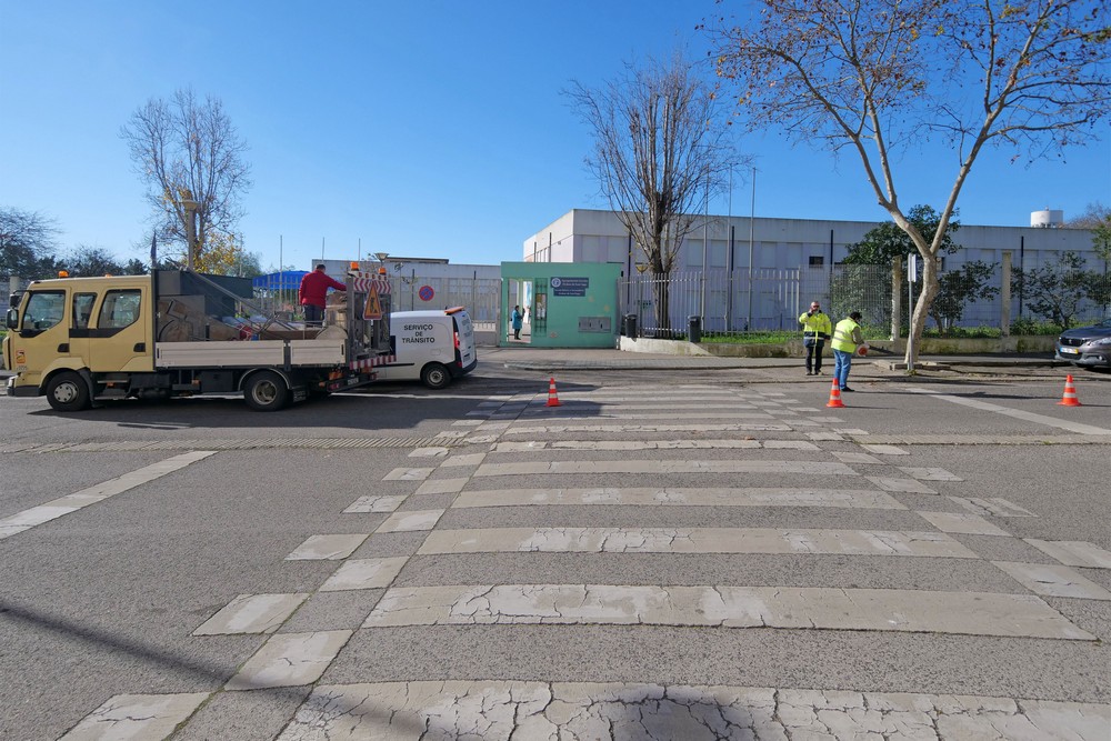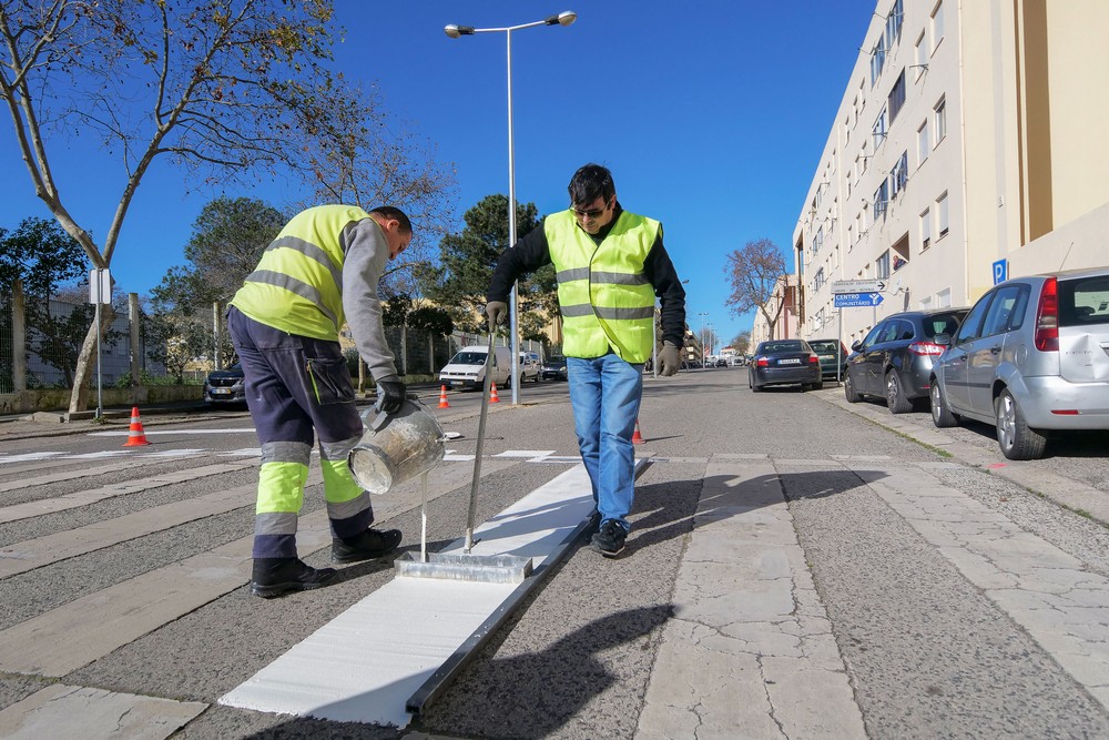 Trabalhos de manutenção e conservação de sinalização horizontal em diversos arruamentos, nomeadamente em zona de passadeira junto a estabelecimentos escolares no Concelho de Setúbal.