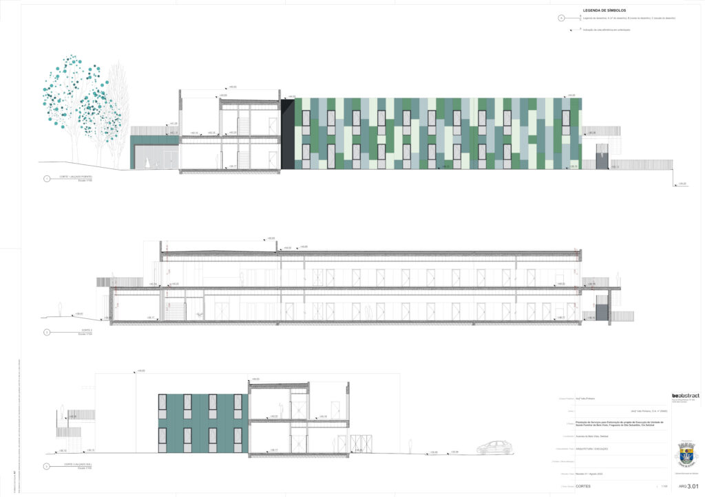 Para o seu desenvolvimento teve-se ainda como referência os critérios gerais estabelecidos nas “Recomendações e Especificações Técnicas para Edifícios Hospitalares” (RETEH), desenvolvido pela Administração Central do Sistema de Saúde (ACSS), publicado em 2018. Por se tratar de uma Unidade de Saúde Familiar e não de um edifício hospitalar, realizaram-se alguns ajustes, mas garantiram-se todas as condições adequadas às exigências dos estabelecimentos deste tipo e às condicionantes do local.