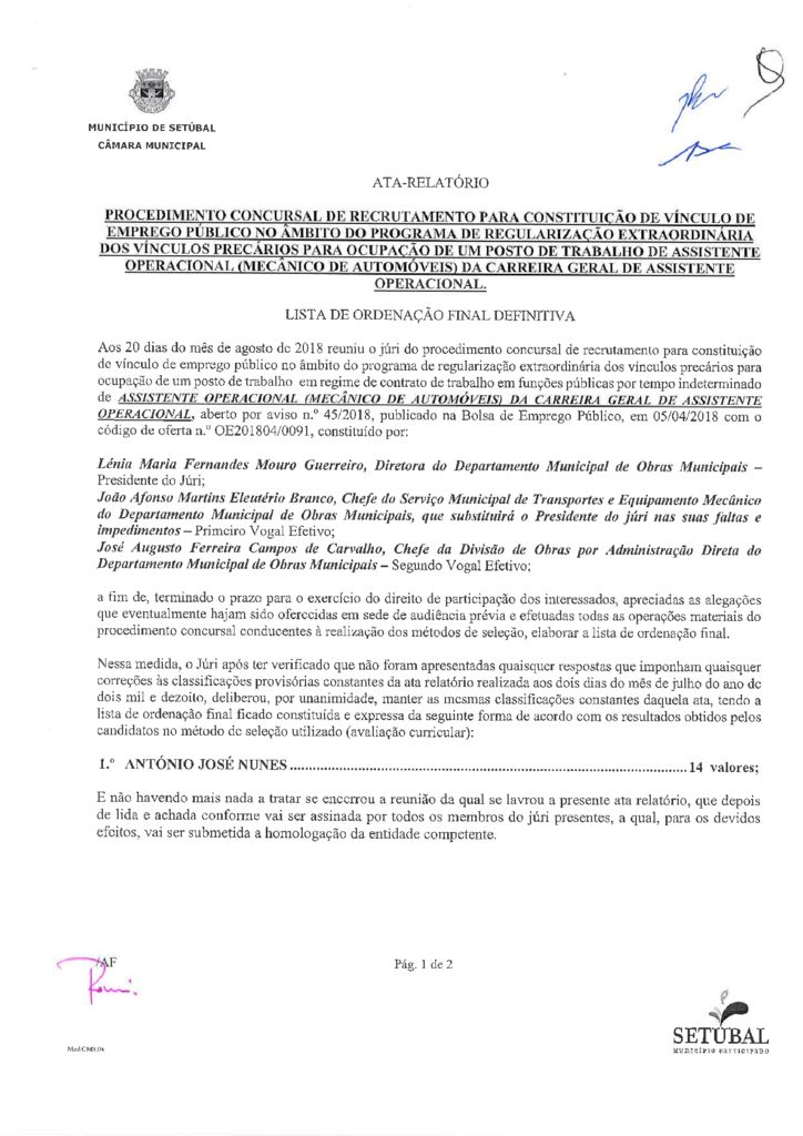 Regularização de Vínculos Precários | Ata Relatório | Lista de Ordenação Final Definitiva | Assistente Operacional Mecânico de Automóveis