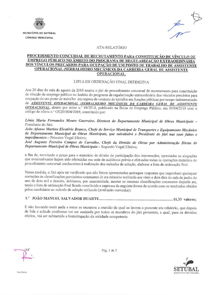 Regularização de Vínculos Precários | Ata Relatório | Lista de Ordenação Final Definitiva | Assistente Operacional Serralheiro Mecânico