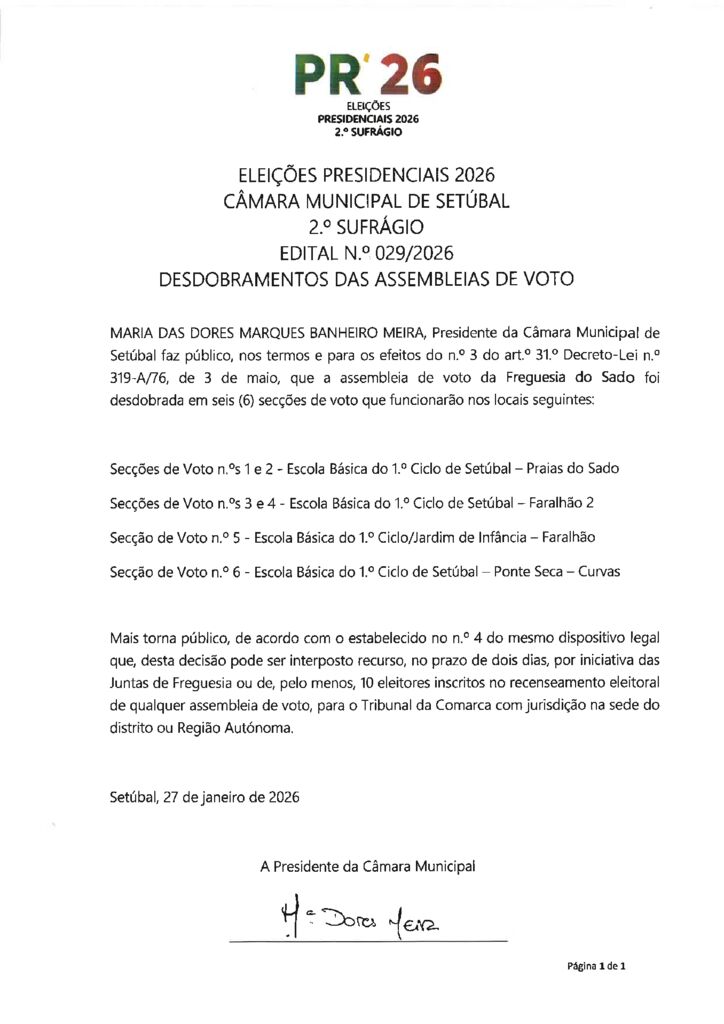 Edital n.º 032-2026 – Desdobramento das assembleias de voto – UF Setúbal
