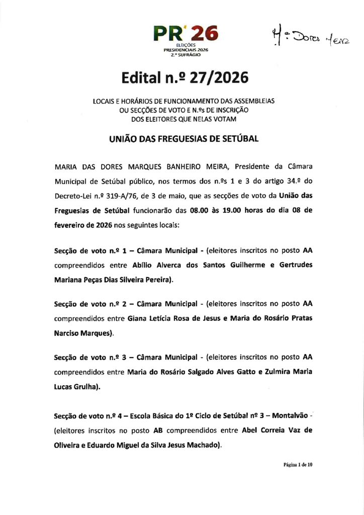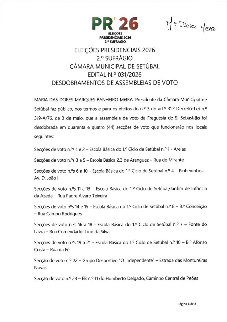 Edital n.º 032/2026 - Desdobramento das assembleias de voto - UF Setúbal