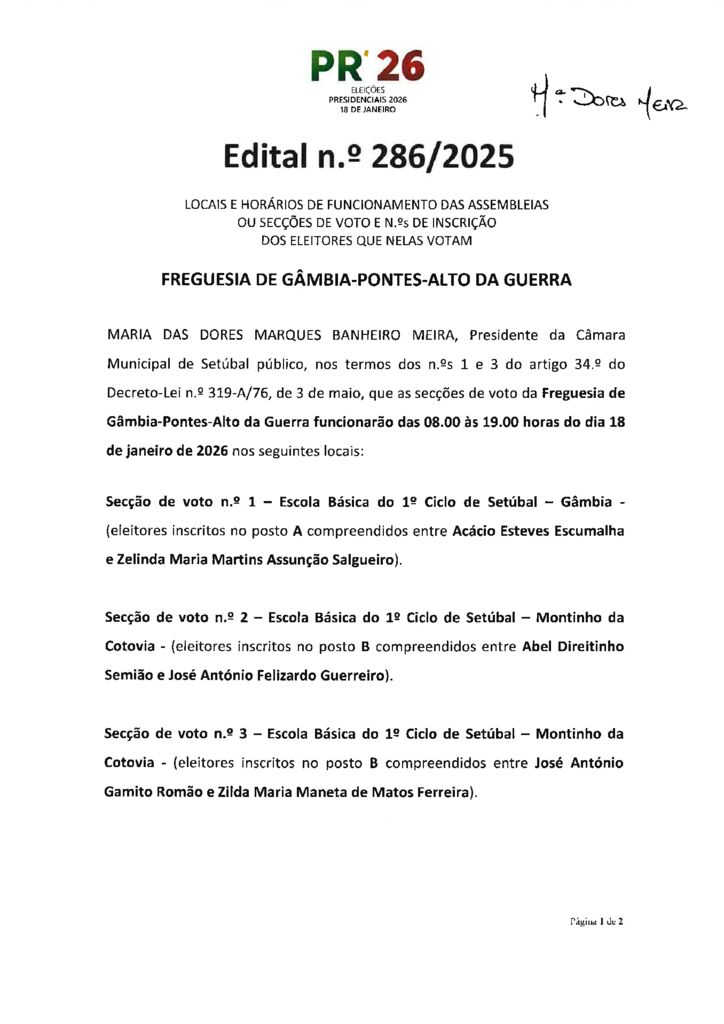 Eleições Presidenciais 2026 | Edital n.º 287-2025 – Locais e horários de funcionamento das assembleias ou secções de voto – JF Sado