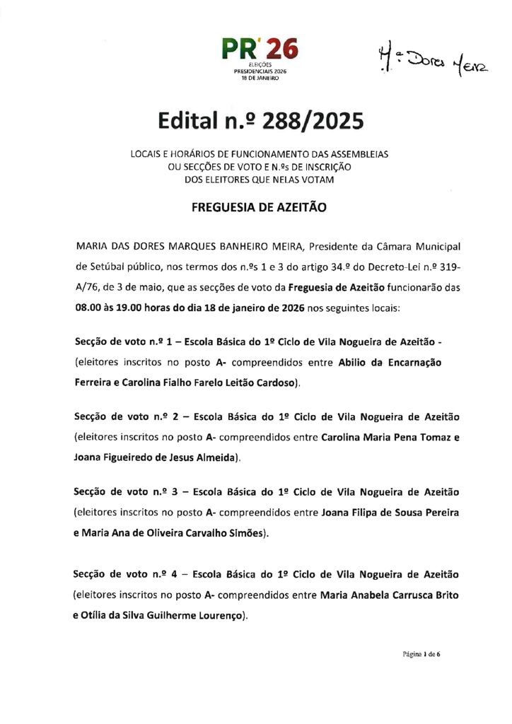 Eleições Presidenciais 2026 | Edital n.º 288-2025 – Locais e horários de funcionamento das assembleias ou secções de voto – JF Azeitão
