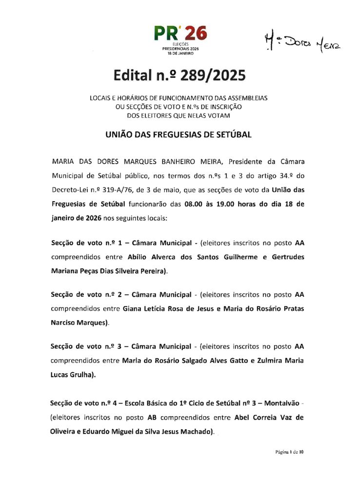 Eleições Presidenciais 2026 | Edital n.º 289-2025 – Locais e horários de funcionamento das assembleias ou secções de voto – UF Setúbal