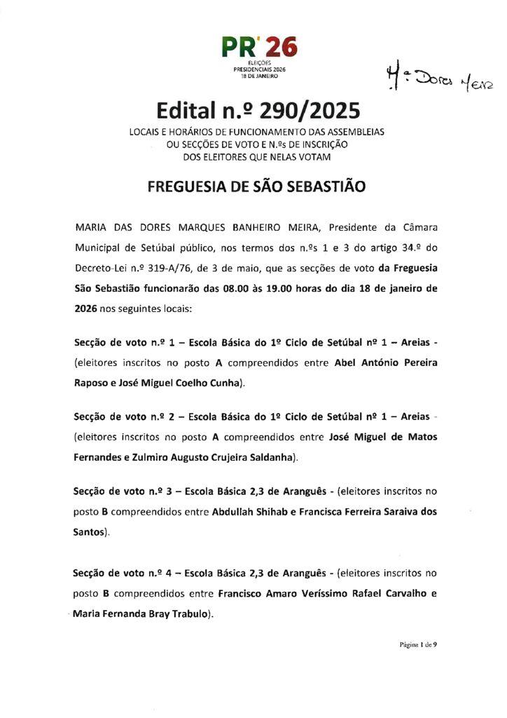 Eleições Presidenciais 2026 | Edital n.º 290-2025 – Locais e horários de funcionamento das assembleias ou secções de voto - JF S. Sebastião