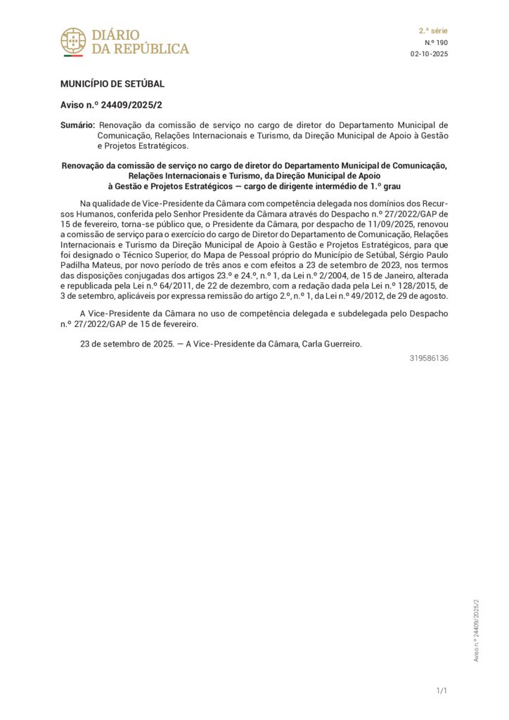 Aviso n.º 24408/2025/2 | Renovação da comissão de serviço no cargo de chefe da Divisão de Obras por Administração Direta do Departamento Municipal de Obras Municipais — Cargo de Dirigente Intermédio de 2.º Grau
