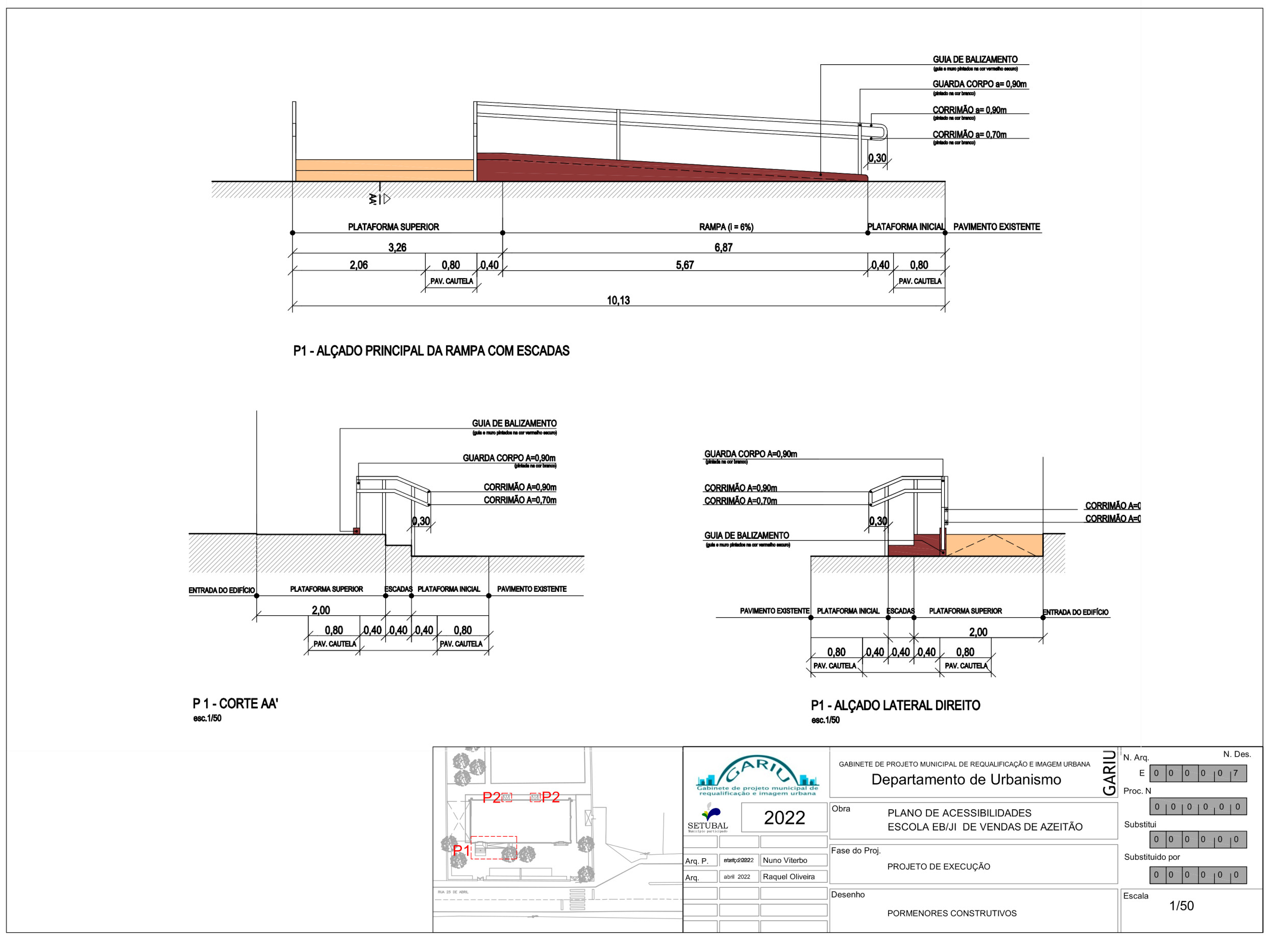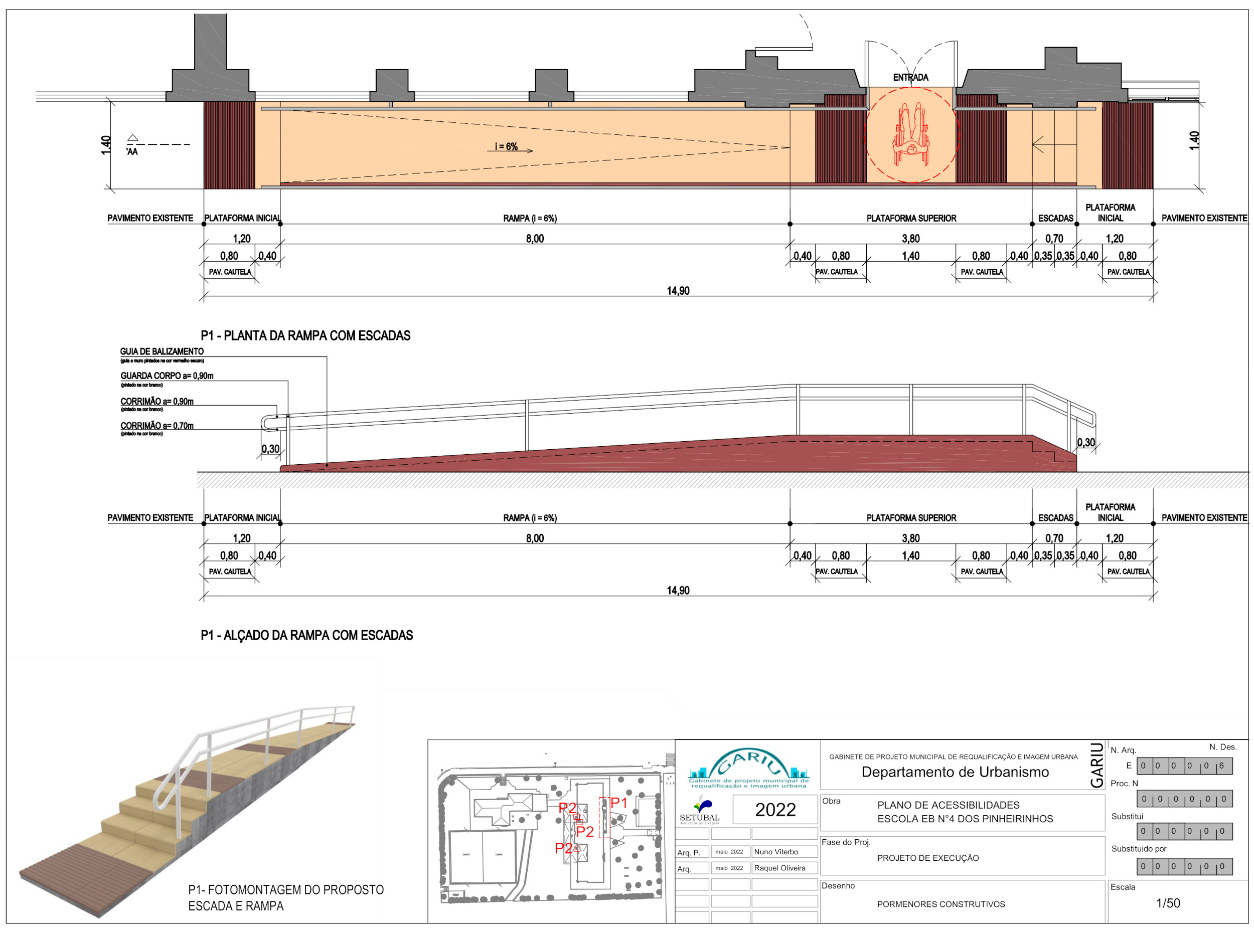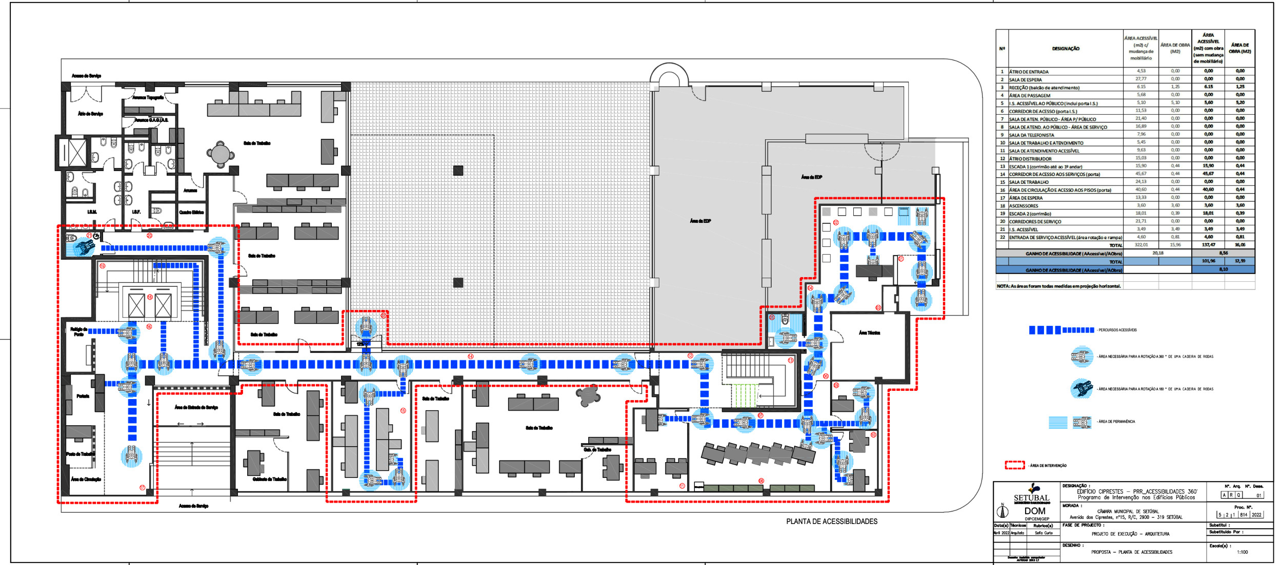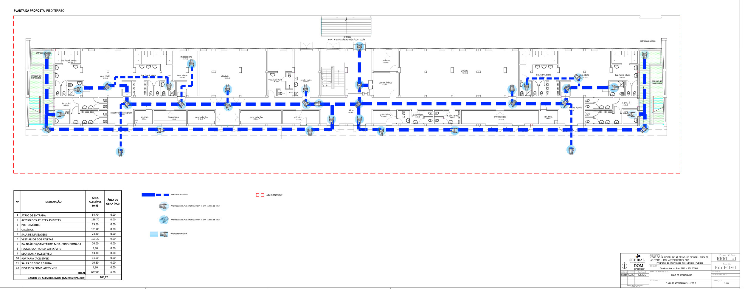 • Na envolvente próxima da entrada do edifício Ciprestes e do Complexo Municipal de Atletismo de Setúbal e no acesso aos mesmos, quer para quem se desloca a pé, quer para quem se desloca em veículos automóveis; Áreas acessíveis em todo o piso térreo de cada um destes edifícios e espaço exterior do Complexo de Atletismo, criando áreas de permanência, de atendimento, instalação sanitária pública, guiché de atendimento e instalações sanitárias para os atletas devidamente equipadas, assim como acesso ao edifício de Complexo de Atletismo rampeado e corrimão na escada de acesso frente à porta dos atletas, que cumprem as Normas Técnicas de Acessibilidades do DL 163/2006 acima referido, aumentando as áreas acessíveis com pequenas obras.