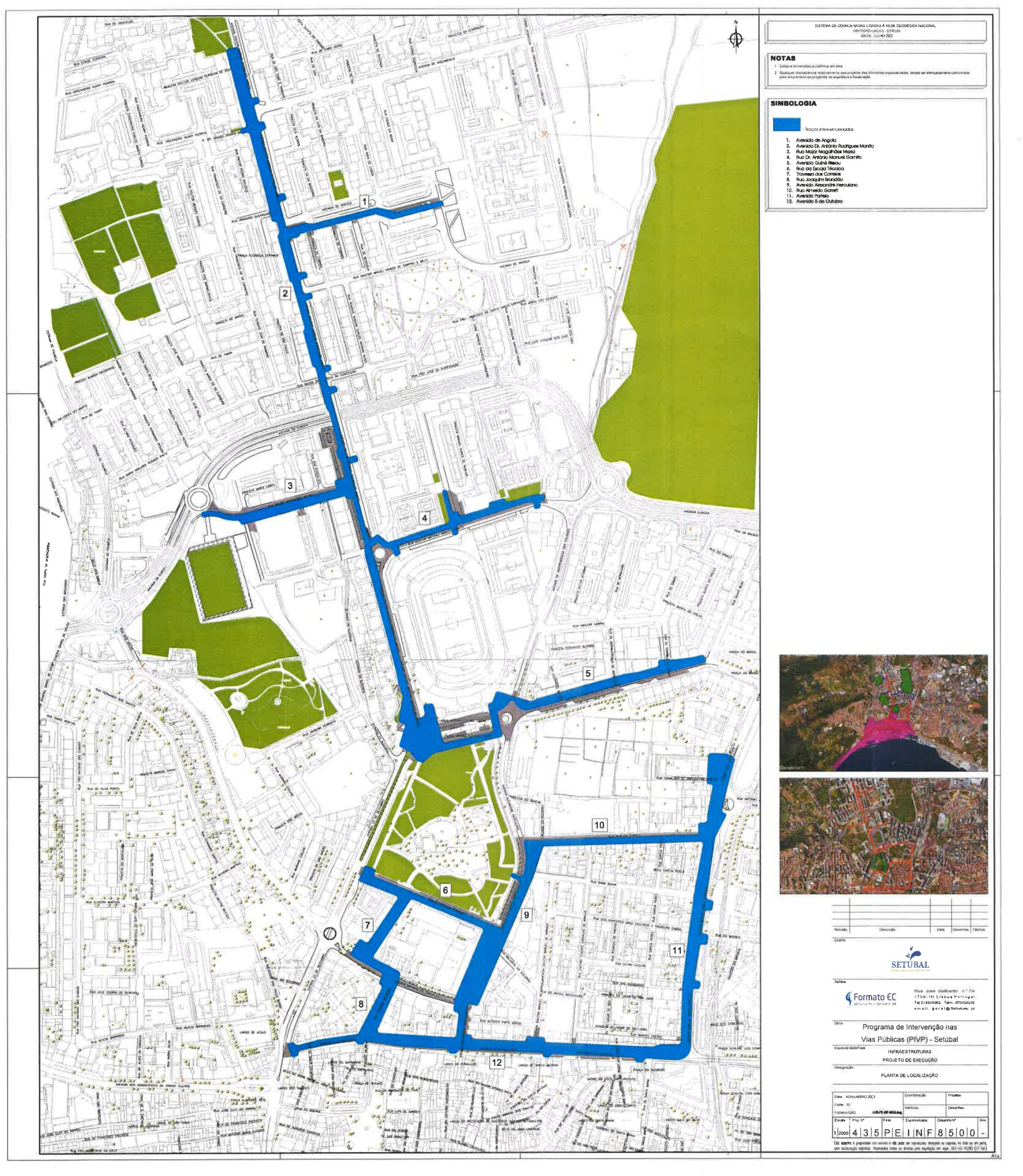 A área de intervenção é caracterizada por 11 eixos rodoviários e um eixo pedonal da área urbana da cidade de Setúbal, de uma topografia de adequada inclinação para a circulação pedonal, abrangendo as freguesias da União de Freguesias de Setúbal e a freguesia de São Sebastião, e cujas necessidades de intervenção se descrevem neste capítulo. Estes eixos são fruto da expansão urbana iniciada desde o centro histórico da cidade dominada pela construção de áreas destinadas predominantemente à habitação, especialmente de edifícios residenciais plurifamiliares, primeiro para norte nos anos 40 e para nascente na década de 90, suplantando em superfície ocupada as áreas residenciais de edifícios plurifamiliares construídas a partir dessa data. Nestas condições a intervenção inclui as seguintes vias: Avenida António Rodrigues Manito / Avenida de Angola / Rua Major Magalhães Mexia / Avenida Dr. António Manuel Gamito / Avenida Guiné Bissau / Avenida Manuel Maria Portela / Travessa dos Correios / Rua da Escola Técnica / Rua Joaquim Brandão / Avenida Alexandre Herculano / Rua Almeida Garrett / Avenida 5 de Outubro