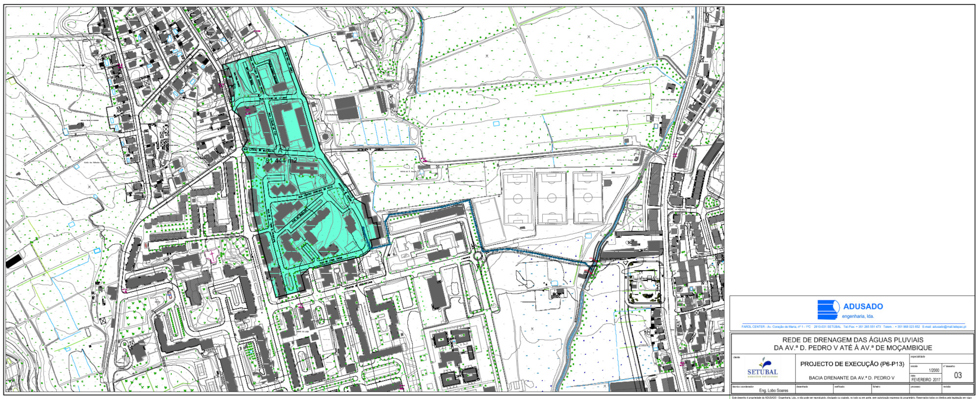 Quer o troço sul da Rua José Gregório, quer o troço nascente da Av. de Moçambique, contêm as plataformas ocupadas com vários coletores e outras infraestruturas, que dificultam em muito a instalação de mais um coletor com secção suficiente para drenar a bacia drenante afluente à Av. D. Pedro V. Foi por isso que se equacionou e se apresentou aos Serviços Técnicos da CM Setúbal a hipótese de desenvolver o coletor de transporte de águas pluviais da Av. D. Pedro V, pelo lado norte da Rua José Gregório, até à Av. de Moçambique, e atingida esta, seguir então a diretriz do futuro prolongamento desta via até à Ribeira do Livramento, onde se fará a descarga na Ribeira, através de uma boca de betão de DN 1000 mm, a qual já está prevista no Projeto de Regularização da Ribeira do Livramento, obra atualmente em concurso público. Esta solução acabou por receber a aceitação dos Serviços Técnicos da CM Setúbal, tendo-se passado à sua implementação a partir da base cartográfica georreferenciada fornecida pela CM Setúbal.