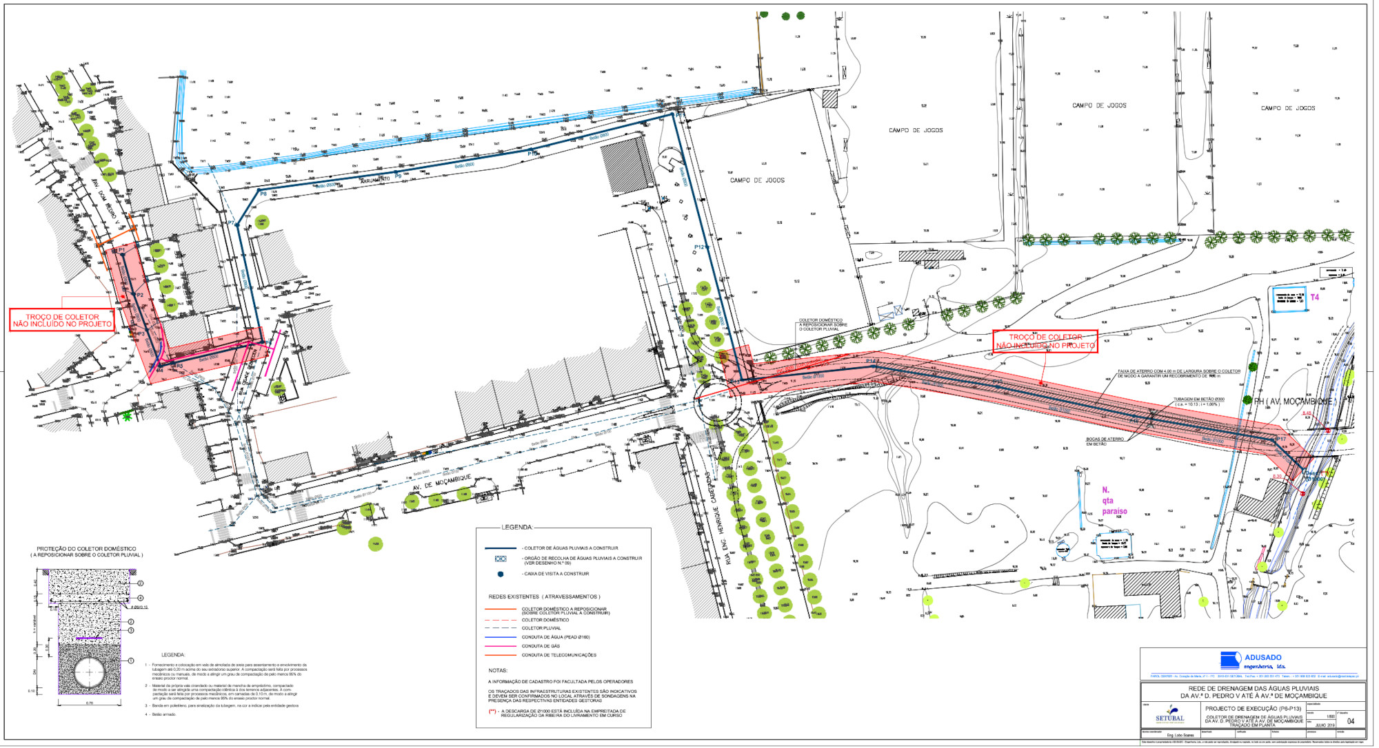 Deste modo este troço de coletor DN 800, a partir da caixa de visita P6 e até à caixa de visita P7, seguirá o traçado do atual coletor DN 700, que será removido. Para jusante não haverá alteração do diâmetro até à caixa de visita P13, localizada já na Av. de Moçambique. A partir desta caixa, o diâmetro do coletor passará a DN 1 000, ao longo do traçado da futura via, até à descarga na Ribeira do Livramento.