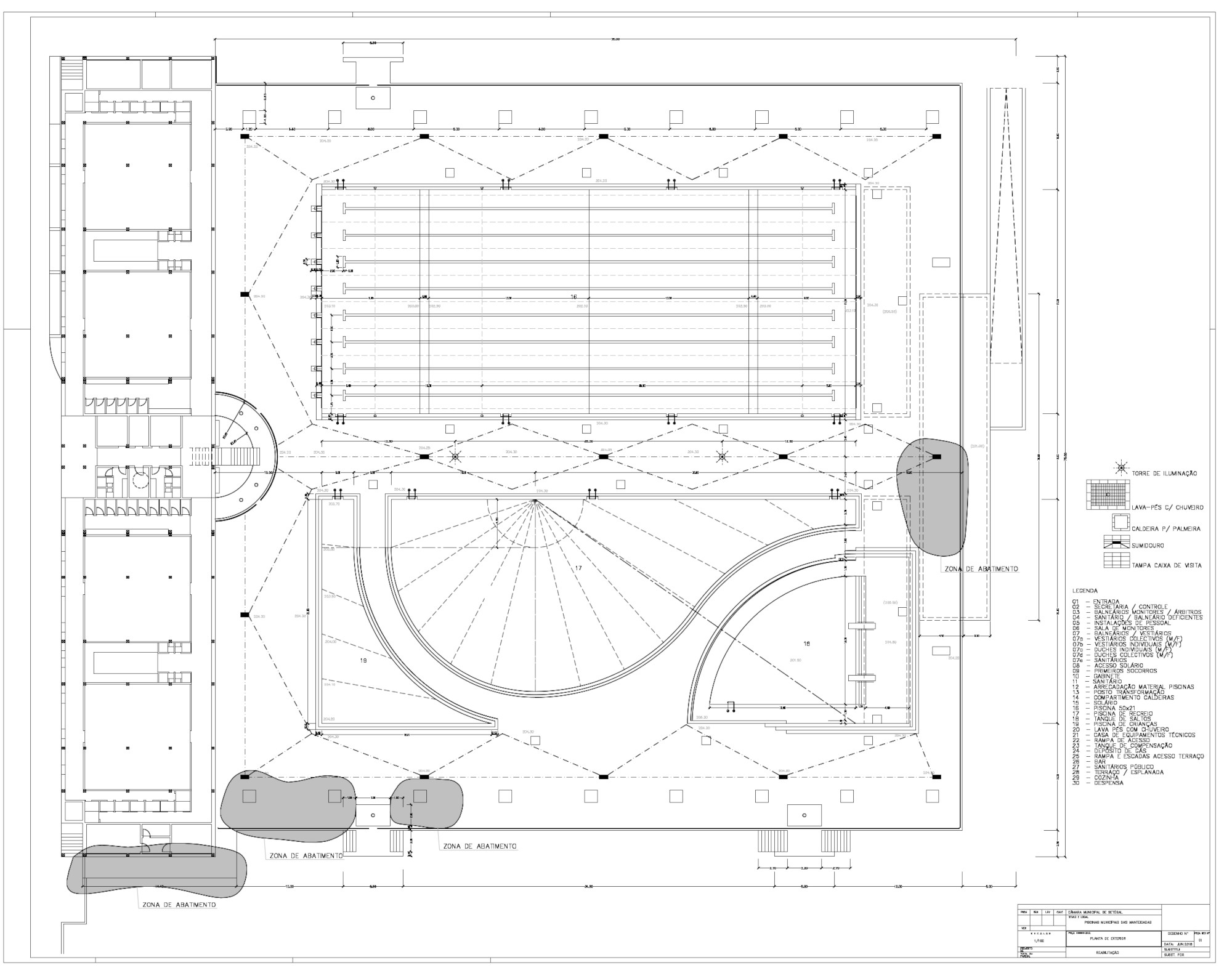 Reparação de pavimentos com abatimento, incluindo o levantamento das lajetas, reposição e nivelamento da camada de fundação com aplicação de 10cm de cascalho e 5cm de massame de betão, reposição das lajetas com reaproveitamento das existentes ou se necessária substituição por novas do mesmo tipo e dimensões, incluindo todos os trabalhos necessários, nas zonas identificadas nas peças desenhadas. Incluiu a reparação/substituição de duas lajetas do rebordo da piscina das crianças