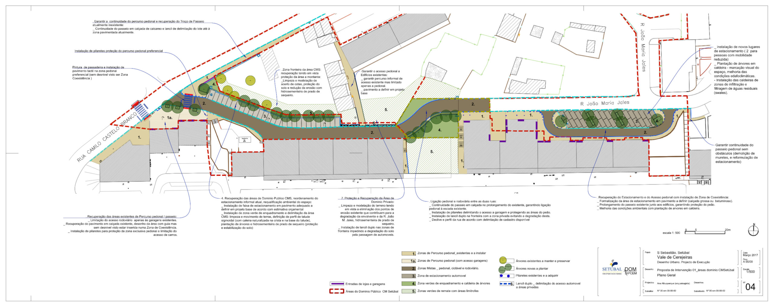 • Reordenar as áreas de estacionamento automóvel atualmente existente com a definição das bolsas de estacionamento, desenho dos lugares e acessos. Instalação de lugares de estacionamento para pessoas com mobilidade reduzida devidamente assinalados. Instalação de pilaretes nos troços e áreas onde é necessário interditar o estacionamento (proteção de zonas verdes, proteção de troços de percurso e acesso pedonal).