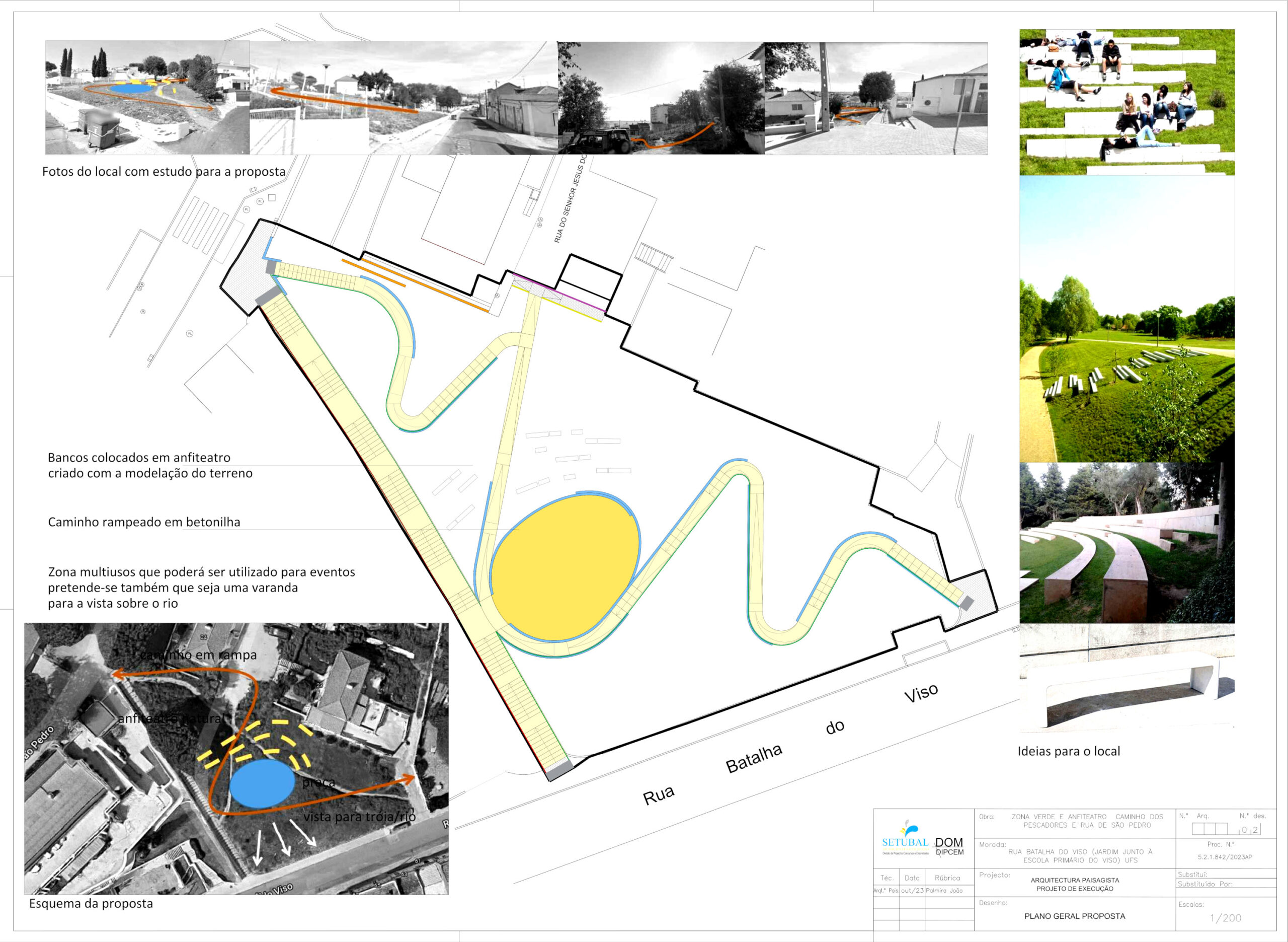 A presente intervenção tem como objetivo a criação de Zona verde e anfiteatro junto ao caminho dos pescadores entre a rua de São Pedro e a Rua Batalha do Viso na União de Freguesias de Setúbal, com cerca de 1500m2 e corresponde a uma área sobrante em talude entre zona habitacional e associação APPACDM de Setúbal, neste momento o espaço não tem utilização e é usado como passagem alternativa a escadas existentes, através de caminho pedonal criado pelos utilizadores.