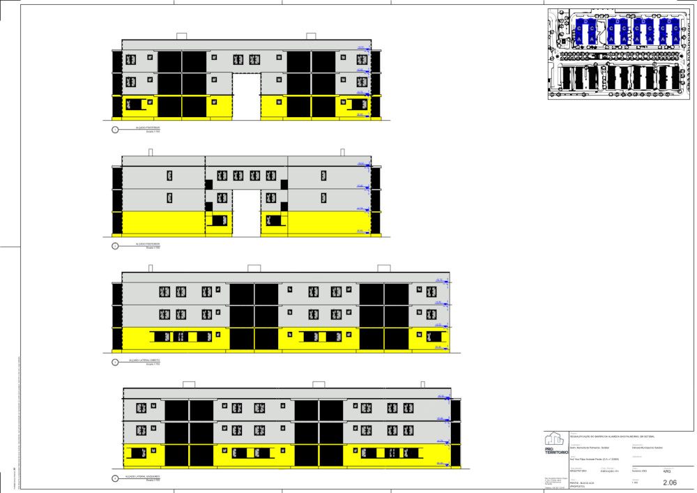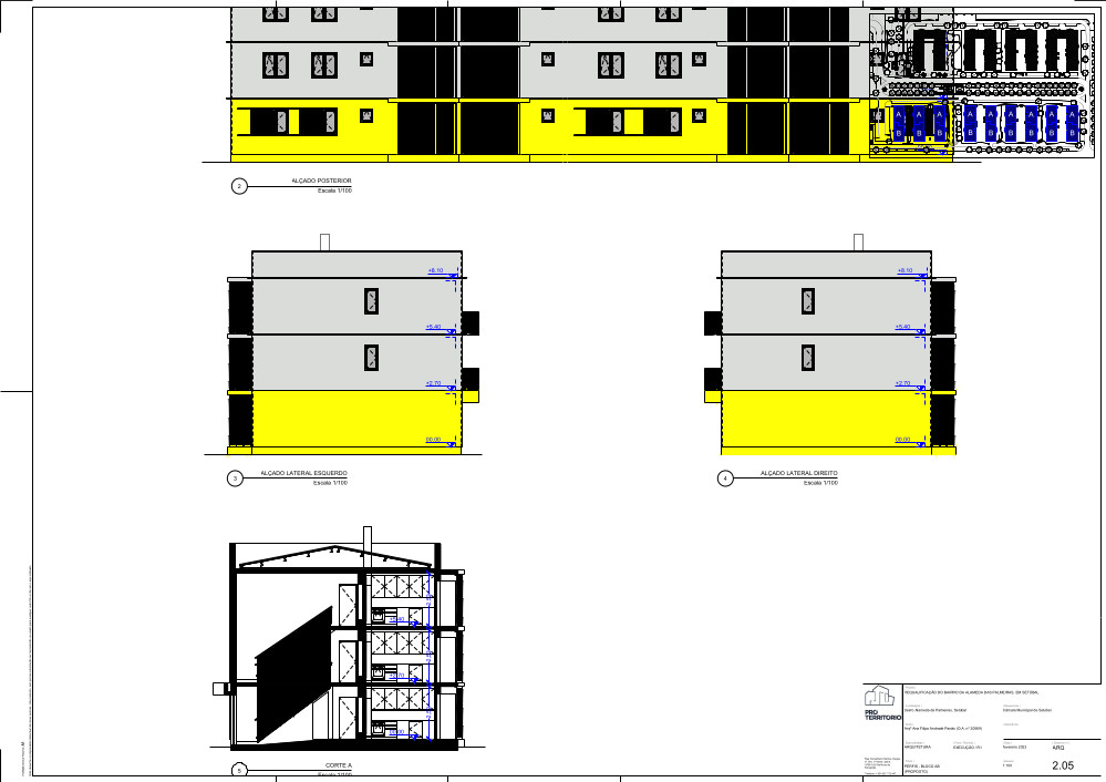 Com o objetivo de renovar a imagem dos edifícios e reorganizar os espaços das fachadas atualmente repletos de estendais à vista, propõe-se a aplicação de volumes executados em estruturas metálicas e revestidos em lâminas, nos pisos 1 e 2, nos lados dos acessos aos edifícios. Esses volumes irão permitir que as roupas dos estendais não fiquem à vista, contribuindo ainda para a integração de unidades exteriores de ar condicionado.