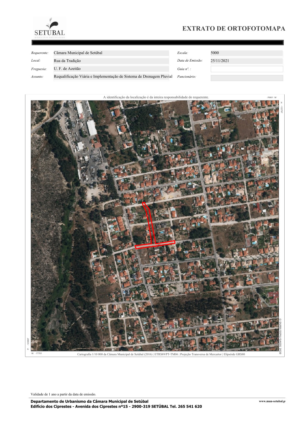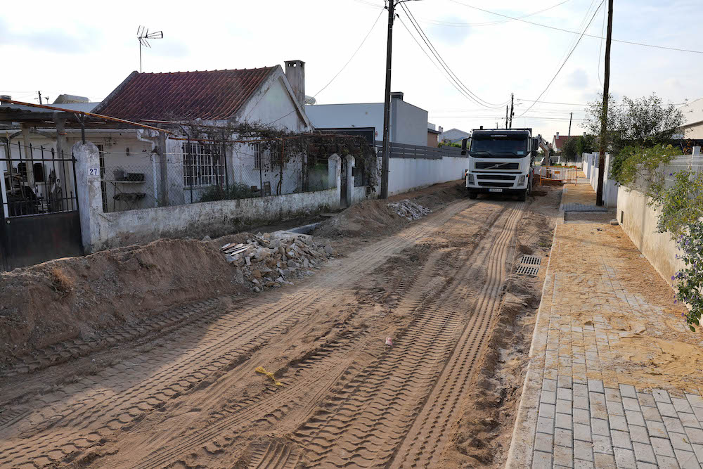 A intervenção, no arruamento anteriormente mencionado, iniciou com a implementação dos dispositivos relativos ao sistema de drenagem de águas pluviais. Só posteriormente se deu início à colocação dos lancis, visando a definição dos traçados dos passeios e da via de circulação viária e pedonal do troço da Rua da Tradição, objeto da presente intervenção. Tal como mencionado anteriormente, a área objeto de intervenção estende-se para além do troço central da Rua da Tradição, função das características topográficas, urbanísticas e de ocupação e uso do solo atualmente presentes no local. Essa área abrange os lotes existentes entre as ruas da Tradição e Cabo das Tormentas, assim como os lotes compreendidos entre a Rua Cabo das Tormentas e a Rua das Mimosas, local onde já existe sistema de drenagem pluvial canalizado. Pese embora os lotes sejam do domínio privado, têm implementado um sistema de drenagem de águas residuais domésticas, que é de cariz integralmente público. Tal facto condiciona o usufruto dos lotes abrangidos pelo traçado da rede de drenagem atendendo a que tem de manter parte da área para servidão publica, isto é, garantir a passagem de uma infraestrutura pública de drenagem pluvial (coletor e câmara de visita), obriga a garantir uma faixa de três metros para cada lado do eixo do coletor, sem qualquer tipo de construção.
